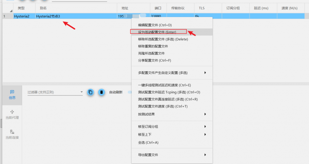 第三步,鼠标选中想用的节点,右键选择设置为活动服务器或者按回车,启用该节点。软件每次只能启用1个节点。